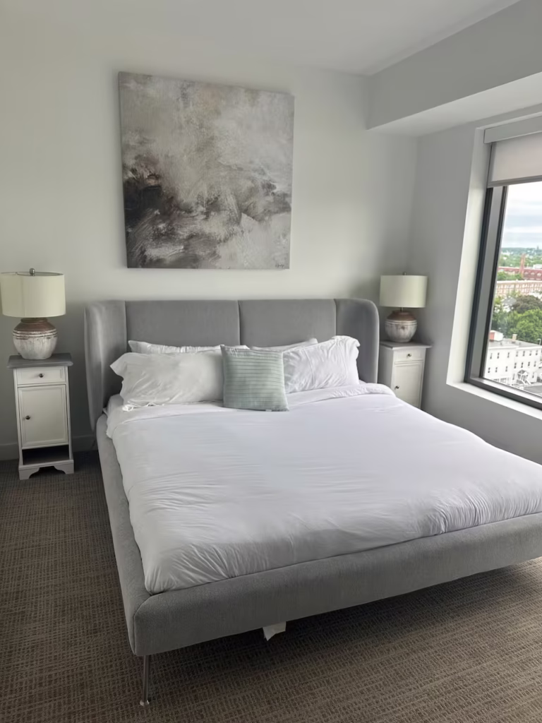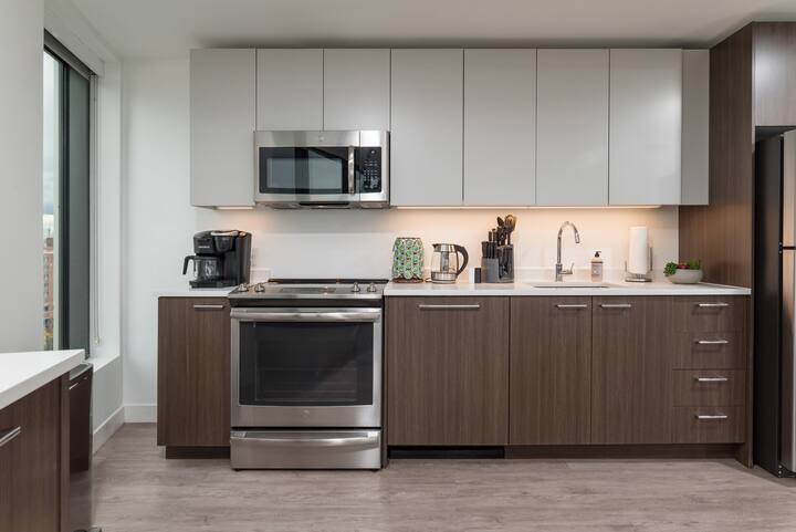 The gourmet Kitchen is fully equipped with everything you need including dishes, glasses, cutlery and pots and pans. The kitchen features Shaker-style birch cabinets and tile floors, granite counter tops and full-size Energy Star GE s stainless steel appliances (four burner stove, oven, microwave, dishwasher and side-by-side full-size refrigerator with ice maker), toaster, and coffee maker. Coffee, tea and sweeteners are provided. Parking is free for monthly stays.